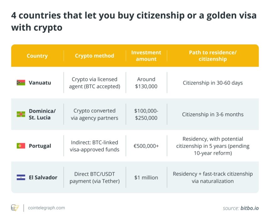 • El Salvador offers direct citizenship through a $1-million Bitcoin or USDT investment, with no fiat needed.