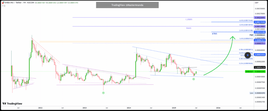 MasterAnanda believes SHIB will break above the triangle and make a run toward $0.000032, aligning with the 0.50 Fibonacci retracement level. If that plays out, the analyst sees a further move to $0.000067, then to $0.00010, which would represent a new all-time high.