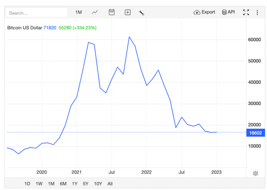Bitcoin price chart from January 1, 2020, to December 31, 2022.