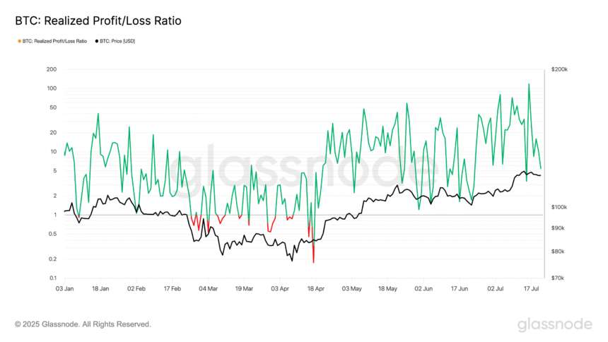 “The Realized Profit to Loss Ratio also pulled back, suggesting that while most investors remain in profit, some are starting to de-risk in light of recent gains.”