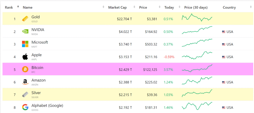 These gains allowed Bitcoin to surpass a $2.4 trillion market capitalization, overtaking Amazon’s $2.3 trillion, Silver’s $2.2 trillion and Alphabet’s (Google) $2.19 trillion, Companiesmarketcap data shows.