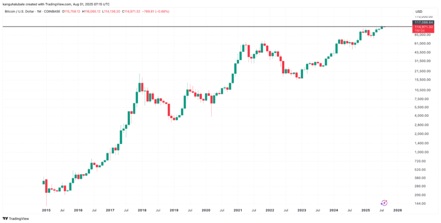 Bitcoin hit a record monthly close at $115,800 on July 31.