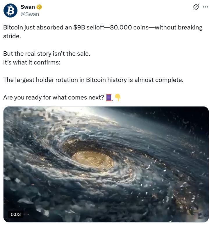 In an X post on Wednesday, Bitcoin financial services company Swan Bitcoin said the largest rotation in Bitcoin (BTC) history is almost complete as the “old guard are being replaced by new titans with conviction,” such as corporations and treasury firms.