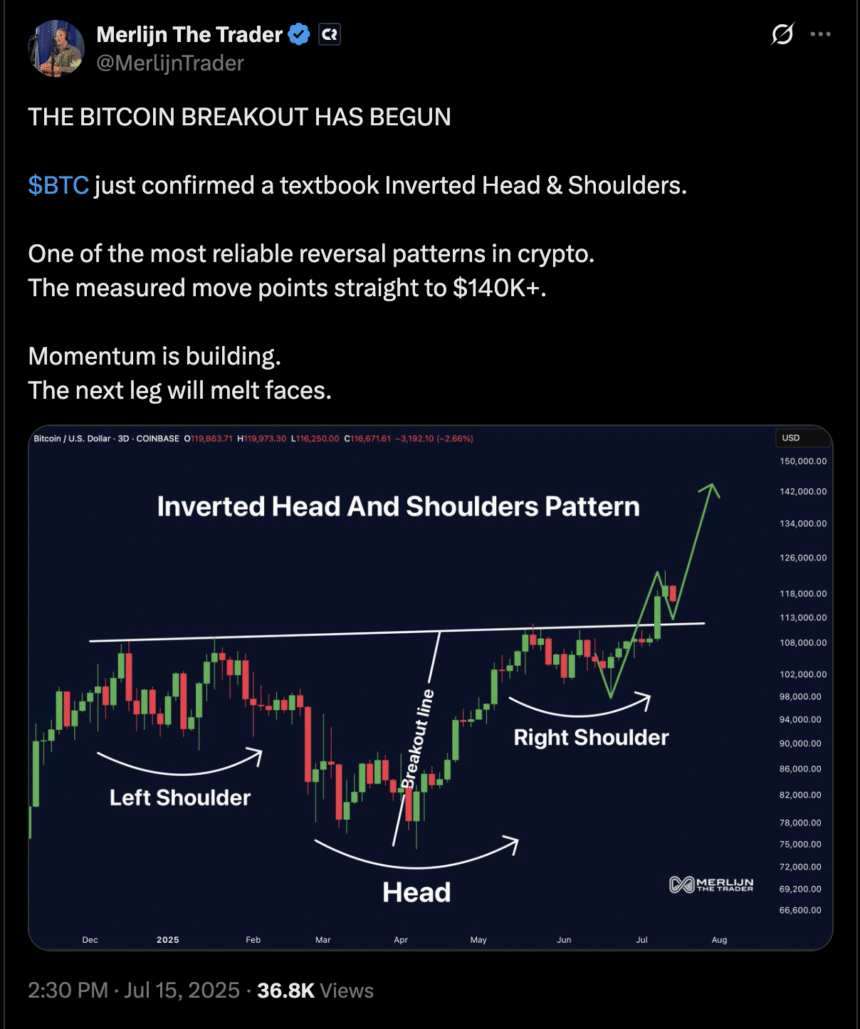 A recent breakout above neckline resistance near $113,000 confirms the structure and opens the door for a measured move toward at least $140,000, according to chartist Merlijn the Trader.