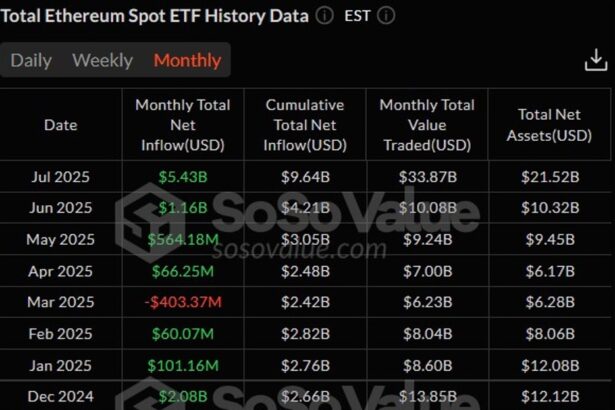United States Spot Ether exchange-traded funds (ETFs) hit a new milestone in July, recording $5.43 billion in net inflows, their highest monthly total since launch, according to ETF tracker SoSoValue. July's…