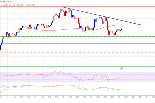 Bitcoin price is still holding the $117,250 support zone. BTC is consolidating and might attempt to clear the $118,600 resistance zone to gain bullish momentum. Bitcoin started a downside correction…