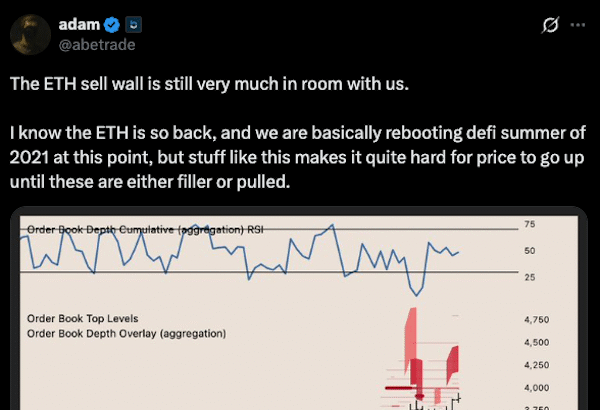 Key point: Ether (ETH) gained 57% over the past month, but consistent selling near $4,000 is putting a cap on the price upside. Independent market analyst Adam pointed to sell walls…