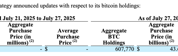 Michael Saylor’s Strategy, the world’s largest public holder of Bitcoin, reported no Bitcoin buys last week despite the asset seeing volatility after breaking all-time highs in mid-July.Strategy’s Bitcoin (BTC) holdings…