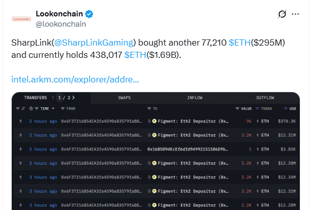SharpLink Gaming, the second-largest corporate holder of Ether, has acquired another 77,210 Ether, worth $295 million, as the firm shows no signs of slowing down its crypto treasury play. The…