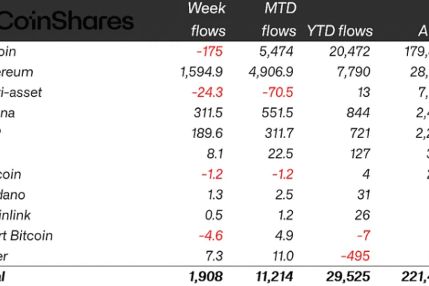 Cryptocurrency investment products ended last week in the green, marking 15 consecutive weeks of inflows, even as Bitcoin funds saw minor outflows.Global crypto exchange-traded products (ETPs) recorded $1.9 billion of…