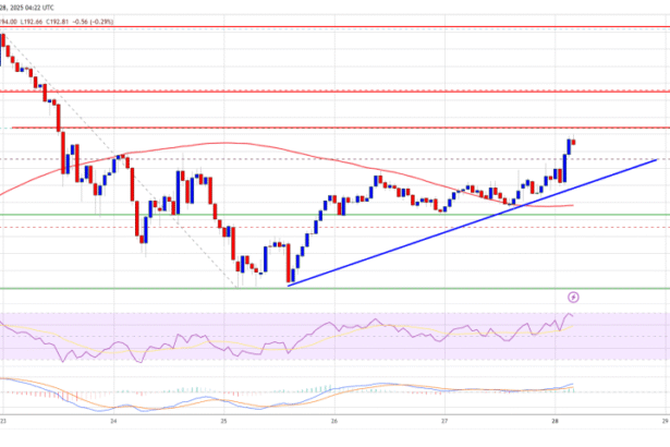Solana started a fresh increase above the $188 zone. SOL price is now consolidating gains and might aim for more gains above the $200 zone. SOL price started a fresh…