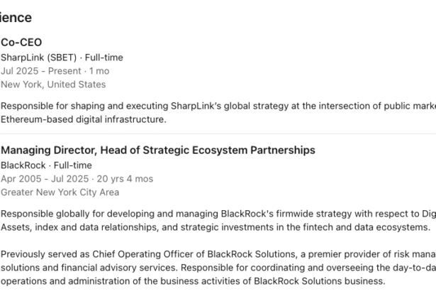 Sharplink, a major public company with significant Ether holdings, has hired a veteran BlackRock executive as the corporate Ether treasury race heats up.Former BlackRock senior executive Joseph Chalom has joined…