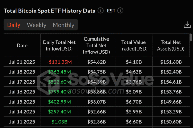 Spot Bitcoin exchange-traded funds (ETFs) registered a net outflow of $131.35 million on Monday, marking the end of a bullish 12-day streak that attracted $6.6 billion in inflows.The largest outflow…
