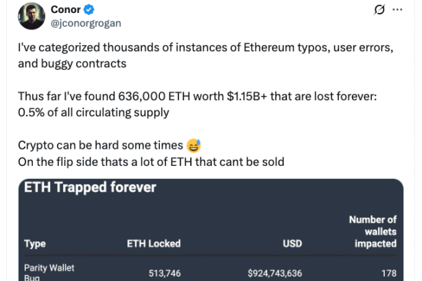 The amount of Ether lost forever due to user error and bugs has reached 913,111 ETH, or approximately 0.76% of Ethereum’s current circulating supply, according to Conor Grogan, head of…