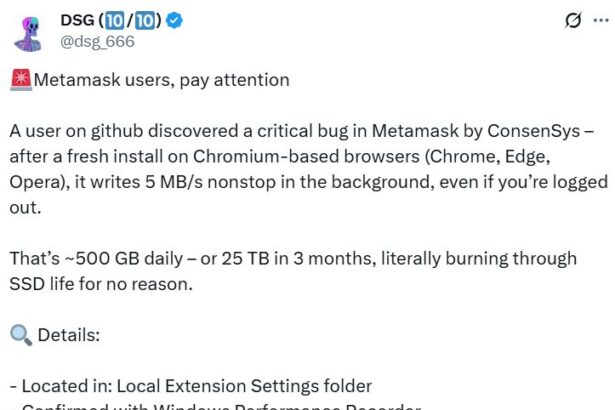 Consensys, the blockchain firm behind MetaMask, has confirmed it will be “imminently” releasing a fix for its MetaMask browser extension after users reported it has been writing hundreds of gigabytes…
