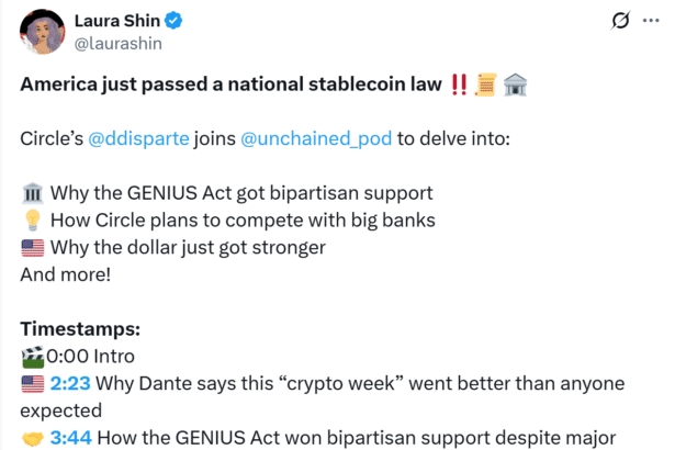 The GENIUS Act contains a little-noticed clause that prevents technology giants and Wall Street behemoths from dominating the stablecoin market, according to Circle Chief Strategy Officer Dante Disparte.“The GENIUS Act…