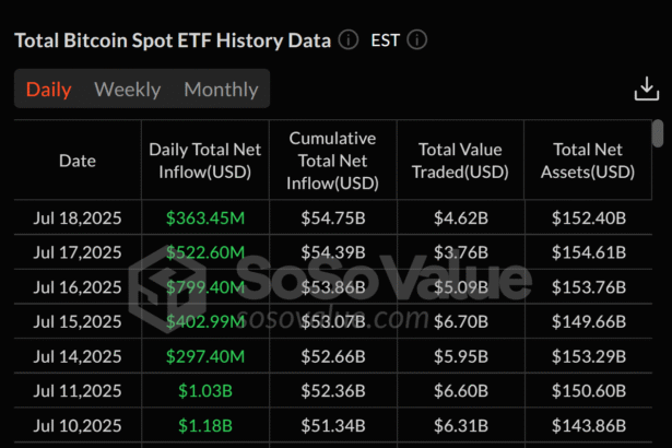 Spot Bitcoin ETFs recorded a net inflow of $363 million on Friday, marking the twelfth consecutive day of net inflows amid strong investor interest.BlackRock’s iShares Bitcoin Trust (IBIT) led the…