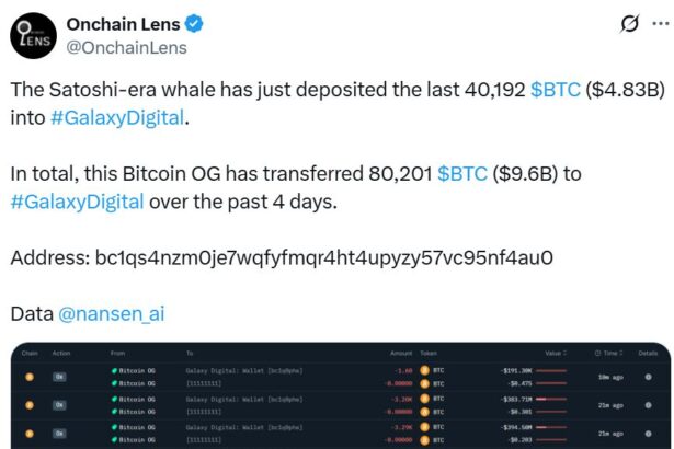 A Satoshi-era Bitcoin whale with 80,201 Bitcoin has shifted the other 40,192 Bitcoin, worth $4.77 billion, to Galaxy Digital, joining a 40,009 BTC transfer to the asset manager on Tuesday. Blockchain…
