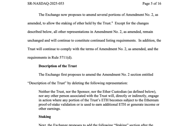 The Nasdaq stock exchange filed an application with the US Securities and Exchange Commission (SEC) on Wednesday on behalf of BlackRock to add staking to the asset manager’s iShares Ether…