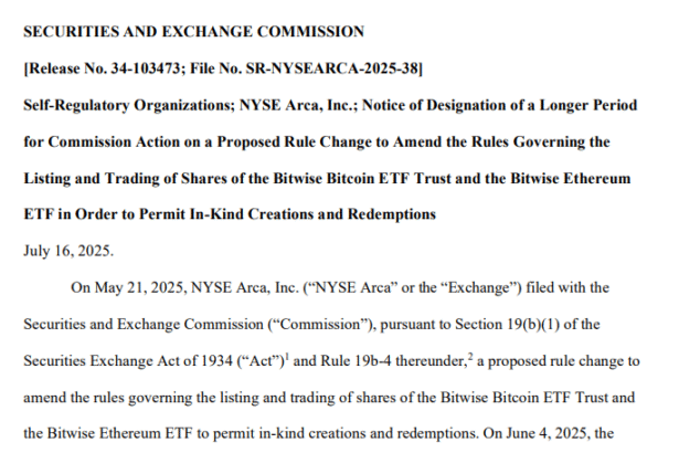 The United States Securities and Exchange Commission (SEC) extended its deadline for ruling on in-kind redemptions for two separate crypto exchange-traded funds (ETFs).According to a Wednesday SEC filing, the regulator…