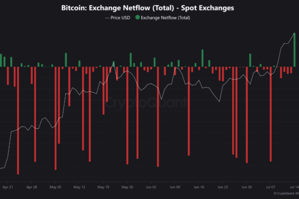 Bitcoin (BTC) surged to a new all-time high (ATH) of $123,218 earlier today, pushing its market cap beyond $2.4 trillion. However, exchange data shows a sharp increase in BTC inflows…