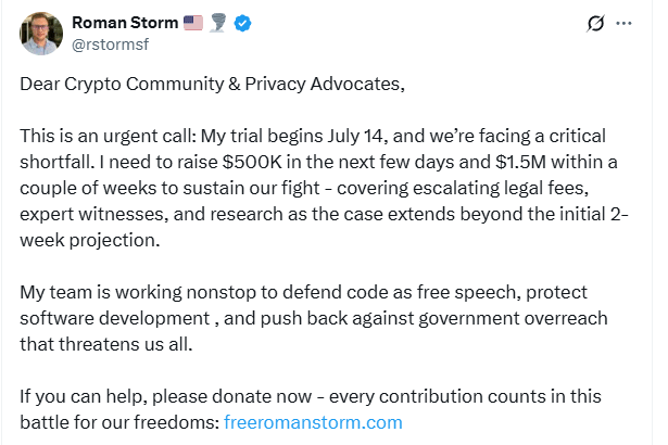 Roman Storm, the co-founder of the crypto mixing service Tornado Cash, has asked for help to raise an immediate $500,000 ahead of his trial on Monday on charges of money…