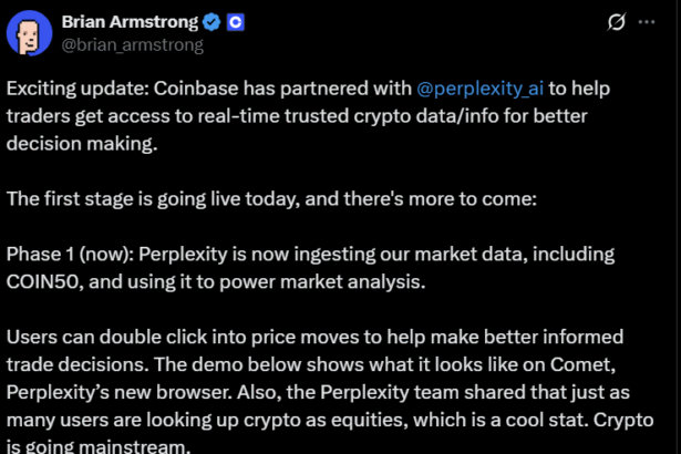 On Thursday, the CEO of Coinbase Global (Nasdaq: COIN), Brian Armstrong, announced a partnership with Perplexity, an AI-powered search engine that answers users’ questions with cited, real-time data pulled from…