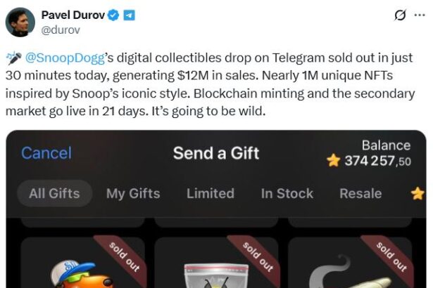 American rapper Snoop Dogg sold out a collection of almost a million non-fungible tokens (NFTs) on Telegram in 30 minutes on Wednesday, seemingly defying the notion that the NFT industry…