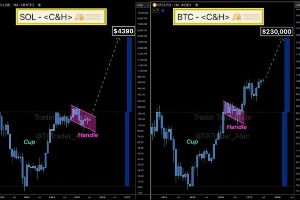Key points:Bitcoin and Solana can reach parabolic new highs if both crypto tokens successfully complete a cup and handle pattern, according to analysis.BTC price and SOL price targets are $230,000…
