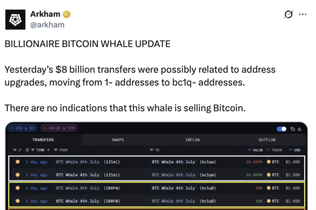 Blockchain intelligence firm Arkham says the recent $8.6 billion in Bitcoin that was moved on Thursday for the first time in over 14 years doesn’t appear to be heading for…