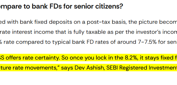 I recently had the opportunity to share my expertise in The Times of India in an article titled “At 8.2%, How does SCSS compare with Bank FDs, RBI Bonds, Mutual…