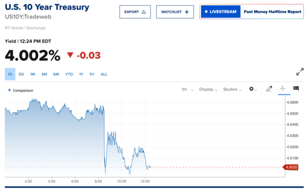 This morning, the 10-year bond yield briefly slipped below 4% on the jobs data before climbing a tad on the warmer inflation report.