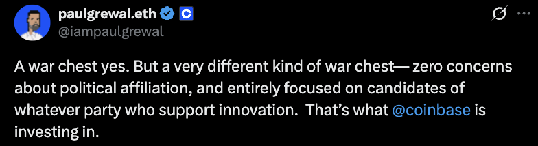 Coinbase’s chief legal officer on the contribution to Fairshake. Source: Paul Grewal