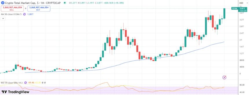 Binance-owned CoinMarketCap shows peak crypto market capitalization figures at $3.8 trillion, while TradingView has the number at $3.9 trillion, higher than the previous peak of $3.73 trillion in December.