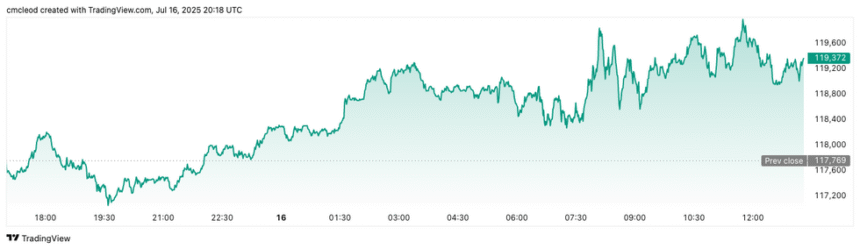Bitcoin (BTC) was priced at US$119,299, up by 2.4 percent in the last 24 hours. The day’s range for the cryptocurrency brought a low of US$118,433 and a high of US$119,676.
