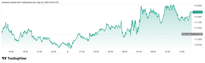 Bitcoin (BTC) was priced at US$112,188, a 1.4 percent increase in 24 hours. Its lowest valuation of the day was US$111,203, and its highest was US$112,502.