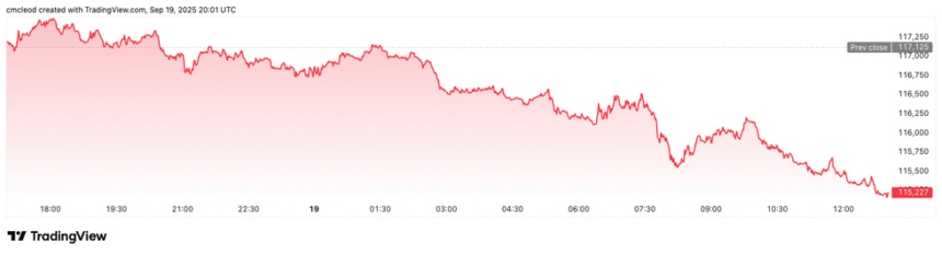 Bitcoin (BTC) was priced at US$115,191, a 1.9 percent decrease in 24 hours, and its lowest valuation of the day, after an earlier price peak to US$116,450.