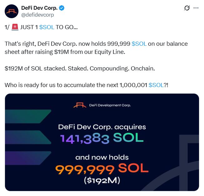 Nasdaq-listed firm DeFi Development Corp is now just one token away from crossing a million Solana in its treasury after its latest $198 million buy.