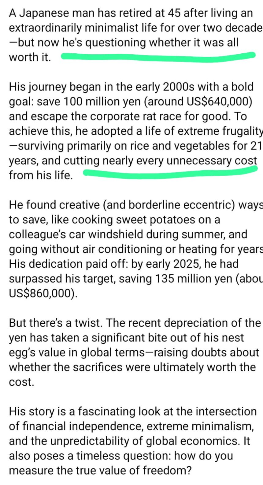 I came across a story of a Japanese individual who pushed himself to extreme levels of frugality to achieve financial freedom by age 45. But once he reached his goal, he realized that the emotional and social cost was too high. He found himself financially free but emotionally exhausted and disconnected from the life he had envisioned.