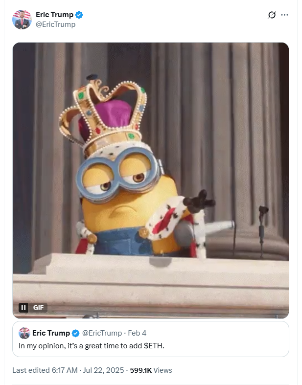 US President Donald Trump’s son Eric Trump took to X on Monday to gloat as Ether surpassed $3,800 amid a month-long rally.