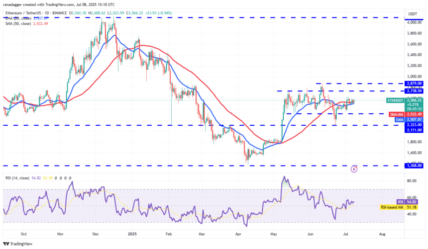 Ether has been maintaining above the 20-day exponential moving average ($2,507) for the past few days, indicating a positive sentiment from traders.