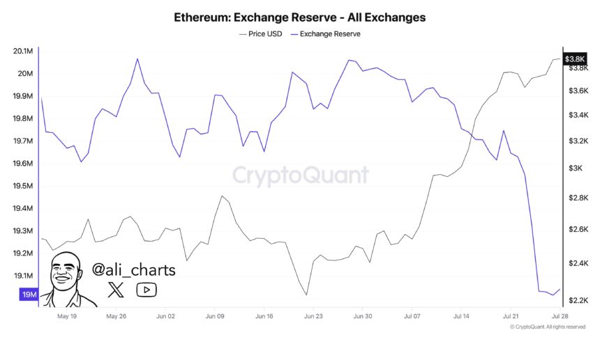 Alongside this withdrawal spree, the ETH price has enjoyed a bull rally beyond the $3,800 level, indicating that the accumulation wave could be a driving factor behind it. The Exchange Reserve may be to keep an eye on now, as where it heads next could also end up having an effect on the asset.