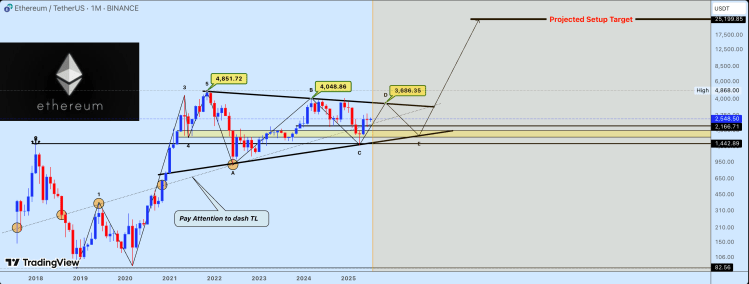 Weslad points to the 2021 Ethereum peak when the price reached $4,851 as the point when a large-scale symmetrical pennant had formed for the digital asset. Interestingly, this has continued for multiple years already, and continues to play out even in 2025, four years later. So far, the analyst believes that the altcoin has been in a long-term accumulation phase in a defined corrective range.