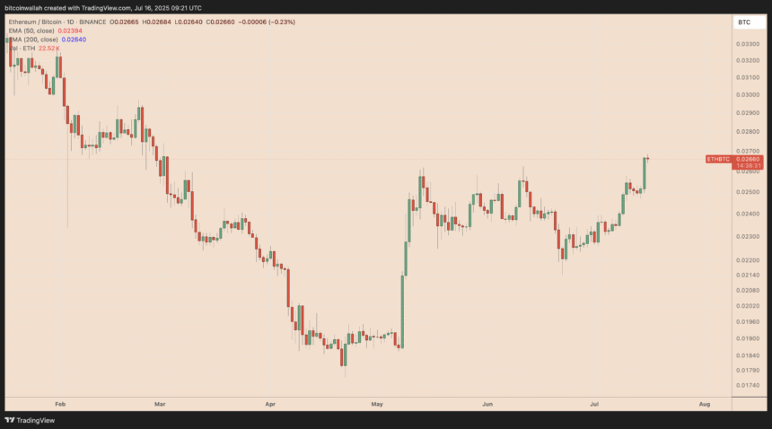Ethereum’s Ether (ETH) token is gaining momentum against Bitcoin (BTC), with its ETH/BTC pair surging over 50% since its multimonth lows in April.