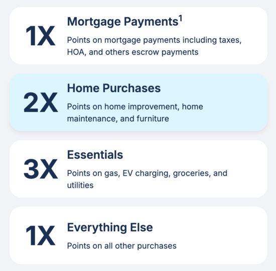 In addition, you can earn bonus points in a variety of home-centric categories that can eventually be redeemed for mortgage-related costs.