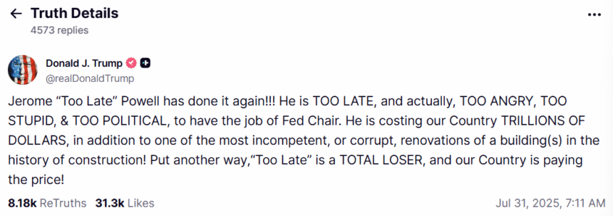 On Thursday, Trump again took to Truth Social to criticize Powell, this time for the Fed’s decision to hold rates steady at its most recent policy meeting.