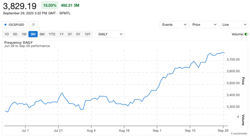 Gold’s record-setting rise continued on Monday (September 29) as the price broke US$3,800 per ounce.