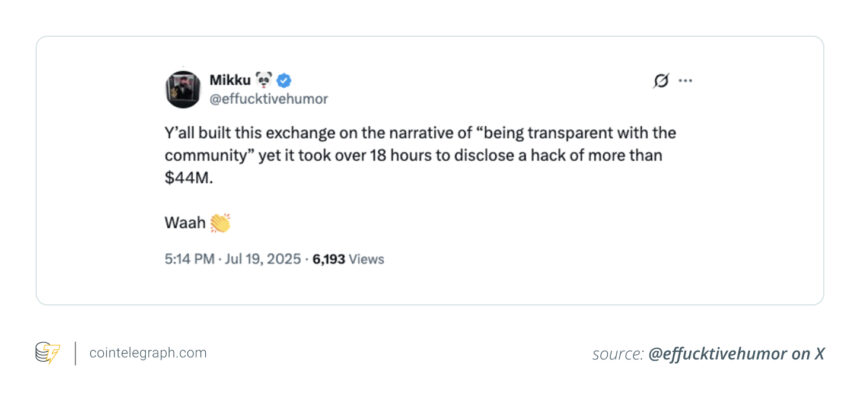 Many in the crypto community were frustrated at CoinDCX’s slow reporting, especially as the organization claims to keep a strong public stance on transparency. Community comments include, “Y’all built this exchange on the narrative of ‘being transparent with the community,’ yet it took over 18 hours to disclose the hack of more than $44 million.”