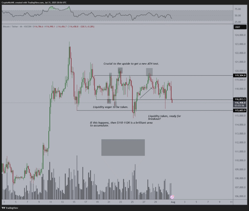 Bitcoin is flirting with downside volatility as it clings to the $115,000 support level, an area market analyst Michaël van de Poppe flagged as essential to continue the uptrend.