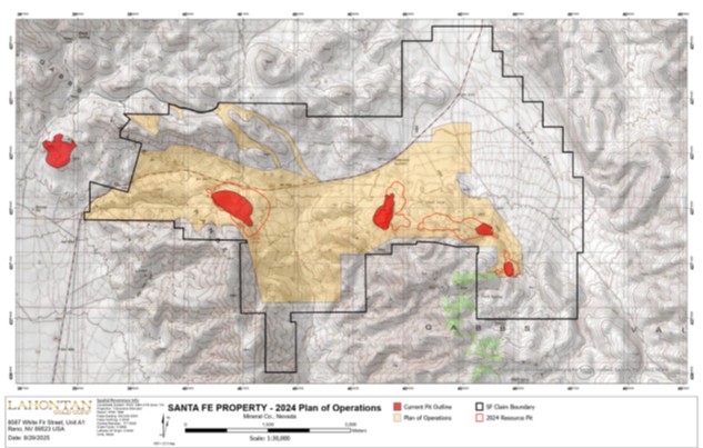 Kimberly Ann, Lahontan Gold Corp. Executive Chair, Founder, CEO, and President commented: “Receiving approval of the Santa Fe Mine project EPOO represents a landmark milestone for Lahontan. Until now, the Company’s exploration activities were limited to a five-acre disturbance area, significantly restricting its ability to step out from known resources and fully assess the exploration potential of the Santa Fe Mine Project. With the approval of the EPOO, Lahontan can now explore a 12.2 km² area encompassing multiple well-defined geological and geochemical targets located between and adjacent to existing gold and silver resources. The expanded permit area also allows for drill testing of the historical heap leach pads, which may contain remnant mineralization of potential economic interest. This approval positions the Company to evaluate the broader gold and silver endowment of the Santa Fe Mine project and to unlock the full potential of its strategic land position in Nevada’s Walker Lane. Lahontan would also like to thank the staff of the Carson City office of the BLM for their efficient and timely completion of the EPOO.”